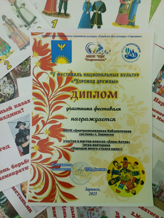 13 сентября библиотека приняла участие в ярком и красочном мероприятии – V фестивале национальных культур “Хоровод дружбы”, который прошёл в ГДК «Строитель». Вниманию присутствующих был представлен стенд “Народов малых не бывает” и выставка научно-популярной и художественной литературы. Жители и гости нашего города смогли познакомиться с книгами о национальном составе Алтайского края, обычаях и традициях разных народностей, рукоделии и ремесле. Особенно интересными оказались книги: о телеутах, освоение Сибири, калмыцкая сага Н. Илишкиной «Улан Далай».